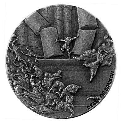 Jeder kennt die Geschichte von Samson und Delilah. Sie ist sowohl Film- als auch Opernstoff und wurde in Popsongs besungen. Eine neue Ausgabe der Biblical Series der Scottsdale Mint zeigt jedoch nicht die Liebesgeschichte, sondern Samsons tragisches und heroisches Ende, gestaltet nach einem Holzschnitt des Künstlers Gustave Doré. Die Silbermünze hat eine streng limitierte Auflage von nur 1499 Exemplaren.