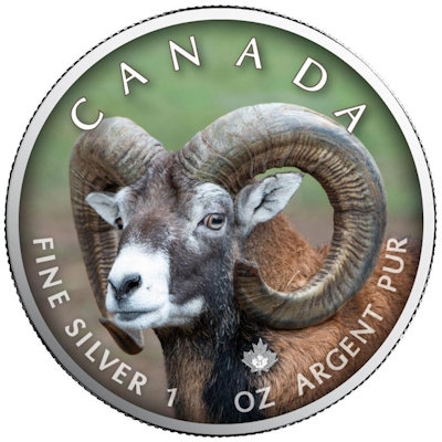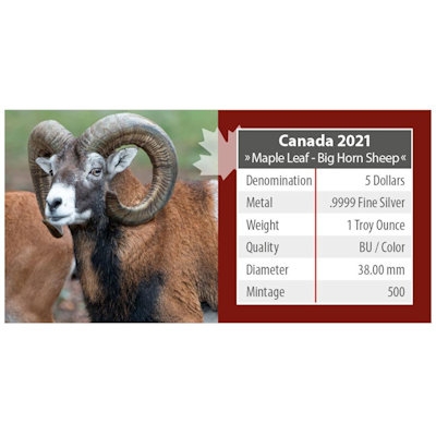 maple-leaf-wildlife-bighorn-sheep-1-oz-silber-koloriertMit einer Auflage von nur 500 Exemplaren pro Ausgabe ist die Maple-Leaf-Sonder-Serie „Canada’s Wildlife“ ideal für die Tierfans unter den Münzsammlern. Jede der Silbermünzen zeigt ein naturgetreu koloriertes Tierporträt eines typischen Vertreters der kanadischen Fauna. Da darf natürlich das Dickhornschaf (bighorn sheep) nicht fehlen. An ihren schneckenförmigen Hörnern sind die Wildschafe sofort zu erkennen.