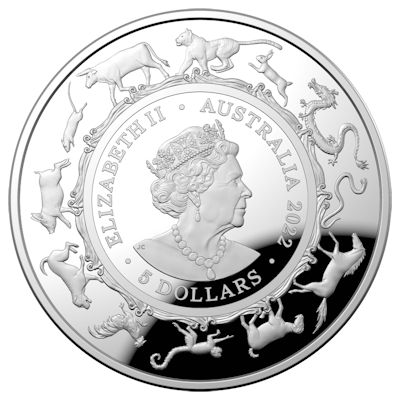 Auf der konvexen Wertseite sind rund um das Porträt der Queen alle zwölf chinesischen Tierkreiszeichen angeordnet. Im Uhrzeigersinn erscheinen Miniaturen von Tiger, Hase, Drache, Schlange, Pferd, Ziege, Affe, Hahn, Hund , Schwein, Ratte und Ochse. Der Nennwert ist mit 5 Dollars angegeben. Die Silbermünze enthält 1 oz Feinsilber und hat einen Feingehalt von 999/1000. Der Durchmesser liegt bei 39,62 Millimetern. Das Sammlerstück mit glattem Rand ist in höchster Proof-Qualität geprägt und in ein stilvolles Etui sowie einen Shipper in der chinesischen Glücksfarbe Rot verpackt. Ein nummeriertes Echtheitszertifikat gehört auch dazu.