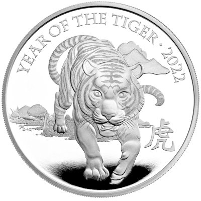 Unter den neuen Lunar-Münzen fällt die Version der Royal Mint sofort ins Auge, weil sie den Tiger aus einer spannenden, frontalen Perspektive zeigt. Die linke Vorderpfote erhoben springt die kräftige Großkatze geradezu dem Betrachter entgegen. Dank der hochwertigen Proof-Prägung kommen die Streifen des Fells und Details wie die Schnurrhaare oder die Krallen hervorragend zur Geltung. Seitlich ist das chinesische Schriftzeichen für Tiger zu finden, oben die Jahreszahl. Das neue Jahr des Tigers beginnt am 1. Februar 2022. Auch 2010, 1998, 1986, 1974, 1962, 1950 und 1938 waren Tiger-Jahre.