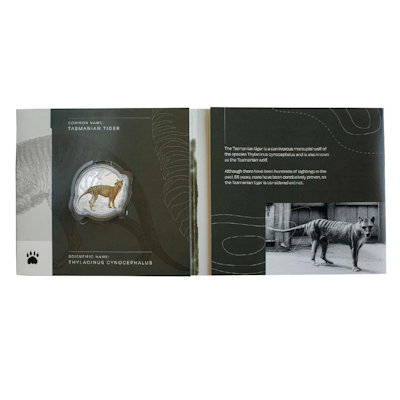 Der Schwanz und der Kopf des Tiers durchstoßen seitlich das Rund der Münze und geben ihr eine ungleichmäßige Form. Das Feingewicht von 1 oz Silber ist randläufig verzeichnet, der Feingehalt von 99,99 Prozent direkt unter dem Brustkorb des Beutelwolfs. Als Ausgabeland fungieren die Solomon Islands, dren offizielles Staatsoberhaupt Königin Elizabeth II. ist. Ihr Porträt ist auf der Wertseite zu sehen, umrahmt von Gräsern und Blättern. Der Nennwert liegt bei 2 Dollars. Die Silbermünze wird in einer Blisterverpackung ausgeliefert, die ein paar Hintergrundinformationen zum Tasmanian Tiger enthält.