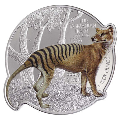 Manchmal sind Übersetzungen irrtierend. So wird zum Beispiel der Tasmanian Tiger auf Deutsch Beutelwolf genannt. Näher verwandt war das räuberisch lebende Beuteltier natürlich weder mit Wölfen noch mit Tigern. Als die Europäer in Australien ankamen, lebte es vermutlich schon nur noch auf der Insel Tasmanien, was sich in seinem Namen widerspiegelt. Das letzte bekannte Exemplar der Spezies verstarb 1936 in einem dortigen Zoo. Diese Jahreszahl der letzten Sichtung ist auch auf dem Münzmotiv vermerkt, direkt über der kolorierten Darstellung des Beutelwolfs. Sein auffälliger gestreifter Rücken kommt durch die Farbe gut zur Geltung. Bäume und Gräser bilden den silbernen Hintergrund.