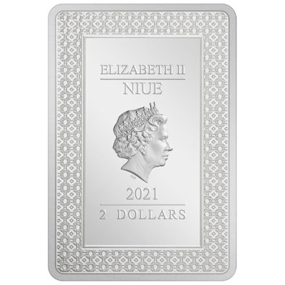 Die Silbermünze ist 53 mal 36 Millimeter groß und hat einen geriffelten Rand. Sie enthält 1 oz Feinsilber (Feingehalt: 999/1000). Die Wertseite zeigt das Porträt der Königin Elizabeth II. von Ian Rank-Broadley über dem Nennwert von 2 Dollars. Auch das Ausgabeland Niue ist hier verzeichnet. Ein ornamentaler Rahmen vergrößter zusätzlich die Ähnlichkeit zu einer Spielkarte. Das Sammlerstück ist in höchster Proof-Qualität geprägt. Das buchförmige Etui rundet das Gesamtpaket ab. Es enthält Infos zur Karte sowie das Echtheitszertifikat.