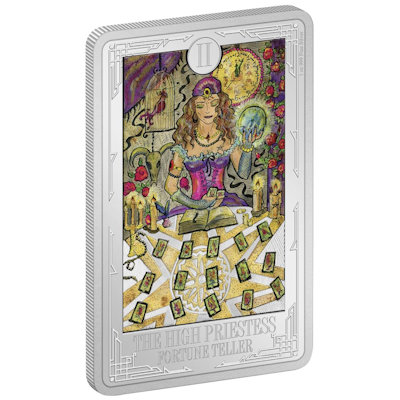 Die Zwei ist eine Karte mit einer spannenden Geschichte. Anfangs war sie als „die Päpstin“ bekannt und zeigte eine Nonne mit der päpstlichen Tiara. Das galt den Geistlichen, die das Glücksspiel ohnehin verdammten, als besonders anstößig. Im 18. Jahrhundert kam schließlich die Vorstellung auf, die Tarot-Karten stammten ursprünglich aus Ägypten. Deshalb wurde die Dame mit der auffälligen Kopfbedeckung fortan als Hohepriesterin interpretiert. Die Decks der berühmten Okkultisten aus der Zeit der vorletzten Jahrhundertwende zeigen sie so. Die Silbermünze der New Zealand Mint präsentiert dagegen eine andere Version: Hier ist die Hohepriesterin als Wahrsagerin dargestellt. Mit einem gelassenen Lächeln deckt sie die Karten auf, vor ihr liegt ein aufgeschlagenes Buch. In der linken Hand hält sie eine funkelnde Kristallkugel. Brennende Kerzen, ein Vogel im Käfig, üppige Blüten und eine Uhr, die kurz nach Zwölf anzeigt, vervollständigen das Bild.