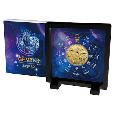 Die antike Götterwelt prägt bis heute unsere Sicht auf den Nachthimmel. Und aus den Sternen leitet die Astrologie schon seit Jahrtausenden Erkenntnisse über das Wesen der Menschen ab. Die Münzserie „Olympians & Zodiac“ mit Ausgabeland Samoa bringt diese beiden Aspekte zusammen. Dem Sternzeichen Zwillinge ist hier zum Beispiel der Gott Apollon (römisch und englisch Apollo) zugeordnet. Die Kupfermünze hat eine Auflage von 3.000 Exemplaren. Auch eine Variante in Silber ist erhältlich.