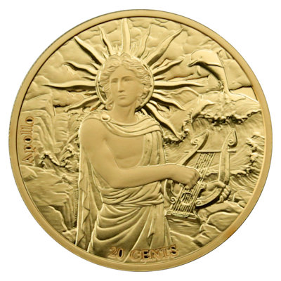 Das Sternbild Zwillinge wird für gewöhnlich mit Castor und Pollux in Verbindung gebracht. Doch auch der Gott Apollon ist ein echter Zwilling: Seine Schwester ist die Jagdgöttin Artemis. Zum kreativen, neugierigen und extrovertierten Sternzeichen Zwilling passt der Gott der Künste aber eindeutig besser. Auf dem Motiv der Kupfermünze sieht man ihn mit einer Leier in der Hand. Sein Kopf ist von einem Strahlenkranz umgeben, da er auch als Gott des Lichts gilt. Apollo steht an der Küste; hinter ihm brandet das Meer an die Felsen und ein springender Delfin rundet die Szene ab. Seitlich findet man den Namen des Gottes, unten den Nennwert von 20 Cents.