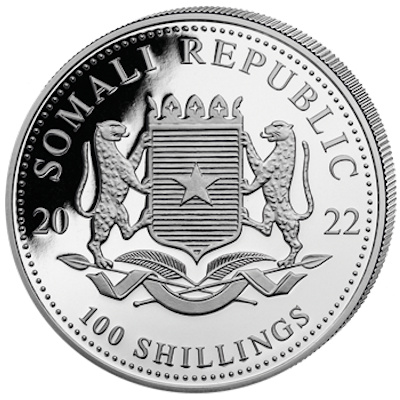 Auf diesem Rahmen sind wie gewohnt der Name „African Wildlife Elephant“ und die Angaben zu Gewicht und Feingehalt aufgeprägt. Die Silbermünze aus 1 oz Feinsilber hat einen Feingehalt von 99,99 Prozent und einen geriffelten Rand. Die Wertseite zeigt das Wappen des Ausgabelandes Somalia mit zwei Leoparden als Schildhaltern. Links und rechts davon sind die beiden Hälften der Jahreszahl 2022 platziert. Der Nennwert ist mit 100 Shillings angegeben. Die Silbermünzen in Stempelglanz-Qualität werden als Agenturausgabe geprägt. Die Weihnachtsedition ist eingebettet in eine Schneekugel. Unter der Silbermünze sind hier die Worte Merry Christmas eingebaut. Der rote Sockel ist zusätzlich mit Weihnachtswünschen in verschiedenen Sprachen bedruckt.