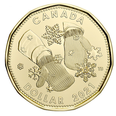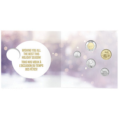 Im Inneren ist neben den Münzen noch Platz für Weihnachtswünsche, wie bei der Royal Canadian Mint üblich in den offiziellen Landessprachen englisch und französisch. Wer möchte, kann hier noch etwas Persönliches dazuschreiben. Neben dem besonderen Dollar enthält das Set einen kompletten Kursmünzensatz: die 2-Dollar-Münze mit dem Eisbären, die Dollarmünze mit dem Eistaucher, die 25-Cent-Münze mit dem Karibu, die 10-Cent-Münze mit dem Segelschiff Bluenose und die 5-Cent-Münze mit dem Biber. Außer der Dollarmünze und dem Inneren der 2-Dollar-Münze, die einen Messingüberzug haben, bestehen die Münzen aus vernickeltem Stahl. Der Gesamtwert beläuft sich auf 4,40 Dollar.