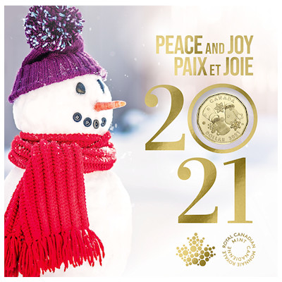 Dieses Jahr stehen die Zeichen ganz auf Spaß im Schnee. Die Karte, in die der Kursmünzensatz verpackt ist, zeigt einen liebevoll dekorierten Schneemann. Roter Schal, violette Bommelmütze und Karottennase sorgen für leuchtende Farbtupfer. Daneben ist in edlem Gold der Text Peace and Joy sowie die französische Version Paix et Joie aufgedruckt. Direkt darunter findet man die Jahreszahl 2021, wobei die Null als Fenster für den Weihnachtsdollar dient. Dieser zeigt zwei ausgestreckte Hände in gestrickten Fäustlingen, auf die detailreich gestaltete Schneeflocken herunterrieseln – eine Szene, die sofort Kindheitserinnerungen ans Schlittenfahren, Schneemannbauen oder Schlittschuhlaufen im Schneegestöber weckt.