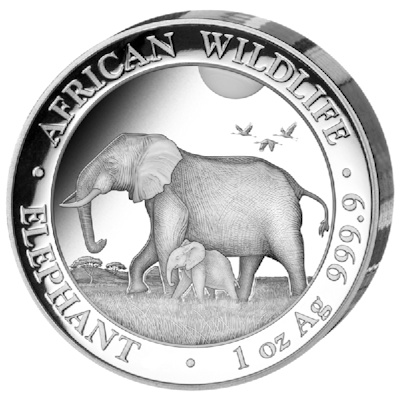 Ein silberner Rahmen, auf dem der Name „African Wildlife Elephant“ aufgeprägt ist, liefert die Informationen zum Feingehalt von 99,99 Prozent und dem Gewicht von 1 oz Feinsilber. Der Durchmesser liegt bei 35 Millimetern. Der Münzrand ist glatt. Die Silbermünze wird als Agenturausgabe geprägt. Die Wertseite zeigt das Wappen des Ausgabelandes Somalia: Zwei Leoparden halten einen Schild mit einem Stern. Sie stehen auf zwei gekreuzten Speeren und zwei Palmwedeln. Der Nennwert ist mit 100 Shillings angegeben.