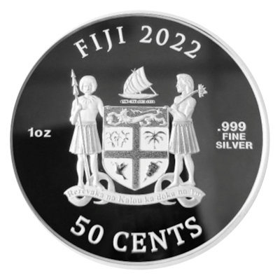 fiji-cats-1-oz-silber-koloriert-wertseiteDie in Prooflike geprägte Silbermünze hat einen Durchmesser von 40 Millimetern. Sie enthält 1 oz Feinsilber, der Feingehalt liegt bei 999/1000. Umseitig findet man das Wappen des Ausgabelands Fidschi: Zwei Krieger halten einen Schild, auf dem ein Segelschiff thront. Der Schild zeigt einige für Fidschi typische Früchte – Zuckerrohr, eine Bananenstaude und eine Kokospalme. Der Löwe oben hält außerdem eine Kakaofrucht. Unten ist der Nennwert von 50 Cents verzeichnet. Die Katzen-Silbermünzen werden einzeln gekapselt ausgegeben.