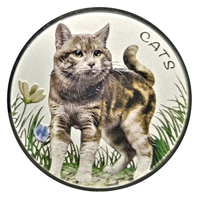 Katzen-Silbermünzen, dafür war bisher die Isle of Man zuständig. Diese neuen Kätzchen haben jedoch das Ausgabeland Fiji und werden in Asien geprägt. Das Motiv zeigt eine Katze im Garten, umgeben von Gras und Blümchen. Sie scheint etwas erspäht zu haben, das sie nun nicht mehr aus den Augen lässt. Der Körper ist angespannt und bereit zum Sprung. Das gefleckte Fell wirkt dicht und weich. Rechts ist randläufig der Titel Cats in schwungvoller Schrift verzeichnet.