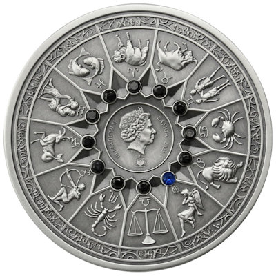 Das Sternzeichen Jungfrau (Ende August bis Ende September) ist umseitig zu finden. Rund um das Porträt der Königin Elizabeth II. ist hier der gesamte Tierkreis abgebildet, wobei die Jungfrau mit einem blauen Schmuckstein hervorgehoben ist. Er erinnert an den Saphir als Geburtsstein des Monats September. Die Silbermünze aus 2 oz Feinsilber (Feingehalt: 999/1000) hat einen Durchmesser von 45 Millimetern und einen geriffelten Rand. Ausgeliefert wird dieses Sammlerstück gekapselt, im Etui und mit Echtheitszertifikat.