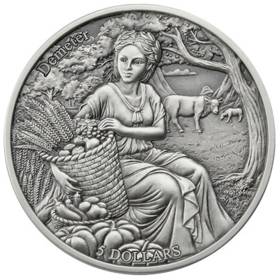 Die Weizenähre ist eines der wichtigsten Attribute der Göttin Demeter. Auf dem Motiv der Silbermünze steckt das Korn zusammen mit anderen Feldfrüchten in einem Korb, den die Göttin im Arm hält. Kürbisse liegen zu ihren Füßen. Im Hintergrund ist eine Viehweide zu sehen, auf der Rinder grasen. Ein Obstbaum vervollständigt das Motiv. Unten ist der Nennwert von 5 Dollars verzeichnet. Die bekannteste Sage um Demeter erzählt vom Raub ihrer Tochter Persephone: Sie wurde mit Hades verheiratet und musste fortan die Hälfte des Jahres in der Unterwelt verbringen. Darüber war Demeter so traurig, dass sie ihre Pflichten vergaß. Erst wenn Persephone im Frühling zu ihre zurückkehren darf, lässt die göttliche Mutter wieder alles wachsen und gedeihen.