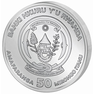 african-ounce-pelican-1-oz-silber-wertseiteAuf dem Motiv der Silbermünze sind ein großer und ein etwas kleinerer Pelikan abgebildet. An den großen Schnäbeln mit dem Kehlsack, am großen Kopf und am kräftigen Körper sind sie zu erkennen. Daneben zeigt das Sammlerstück, wie bei der African Ounce üblich, den Umriss des afrikanischen Kontinents. Bei einem Durchmesser von 40 Millimetern enthält die Silbermünze 1 oz Feinsilber (Feingehalt 999/1000). Der Münzrand ist geriffelt. Die Wertseite zeigt das Wappen der Republik Ruanda, die als Ausgabeland fungiert. Der Nennwert von 50 Amafaranga (Ruanda-Francs) ist unten verzeichnet.