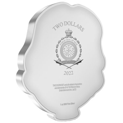 1973 kam ein besonderer Schocker in die Kinos: Der Exorzist ist reich an gruseligen und abstoßenden Bildern, die sich dauerhaft einprägen. Kinos berichteten, dass viele Zuschauer den Saal schon vor dem Ende verließen. Doch gerade wegen dieser extremen Szenen erreichte der Film auch bald Kultstatus und brachte der jungen Schauspielerin Linda Blair einen Golden Globe ein. Als vom Dämon besessenes Mädchen verwandelt sie sich im Film immer mehr in eine Horrorgestalt – und so zeigt sie auch die Silbermünze: geifernd, mit verdrehtem Hals, Schnitten im Gesicht und Mordlust im Blick.