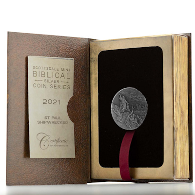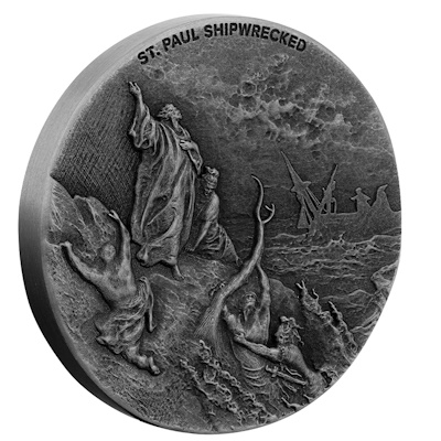 Jahr für Jahr präsentiert die Biblical Series der Scottsdale Mint Szenen aus dem Buch der Bücher. Das Markenzeichen der Silbermünzen-Serie ist die kunstvolle Gestaltung, die Holzschnitte des Künstlers Gustave Doré zum Vorbild hat. Eine der neuesten Ausgaben ist dem Schiffbruch des heiligen Paulus aus der Apostelgeschichte gewidmet. Die Silbermünze mit Antik-Finish hat eine streng limitierte Auflage von nur 1499 Exemplaren.