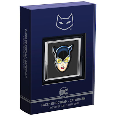 faces-of-gotham-catwoman-1-oz-silber-koloriert-etuiCatwomans Markenzeichen ist der Catsuit aus Lack und Leder: Dieses hautenge Kleidungsstück bedeckt zwar ihren Körper fast komplett, verleiht ihr aber dennoch eine besondere erotische Anziehungskraft, der sich auch Batman nur schwer entziehen kann. Bei ihrem ersten Auftritt 1940 war Catwoman noch einfach eine weitere Verbrecherin, der die Fledermaus das Handwerk legen wollte. Als Meisterdiebin erleichterte sie die Oberschicht von Gotham City um einige Preziosen. Doch Catwoman hat auch ein Herz für die Armen und Schwachen. Wenn es hart auf hart kommt, kämpft sie dehalb mitunter an Batmans Seite.