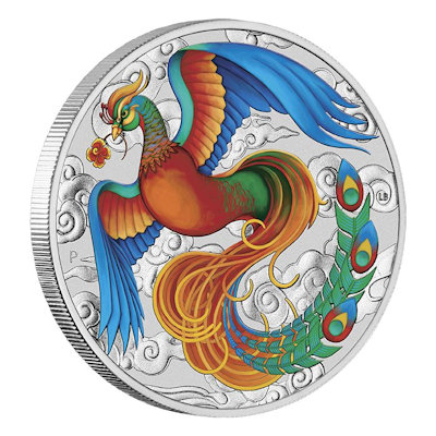 Wie der Drache ist der Phönix ein traditionelles Tier der chinesischen Mythologie, von der sich die Perth Mint gern zu stilvollen Münzmotiven inspirieren lässt. Beide Fabelwesen vereinen in sich die Merkmale verschiedener Tiere. So sieht man dem Phönix auf dieser Silbermünze deutlich seine „Verwandtschaft“ mit dem Pfau an, besonders in der bunt kolorierten Version. Die Auflage ist auf 5.000 Exemplare limitiert.