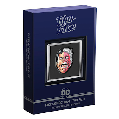 Nach dem Joker ist nun ein weiterer von Batmans beliebtesten Gegenspielern in der Silbermünzen-Serie Faces of Gotham der New Zealand Mint zu haben. Two-Face macht seinem Namen auf diesem Sammlerstück alle Ehre. Relief und knallige Kolorierung lassen ihn unberechenbar und faszinierend verrückt wirken. Die Auflage der Formprägung ist auf 5.000 Exemplare limitiert.