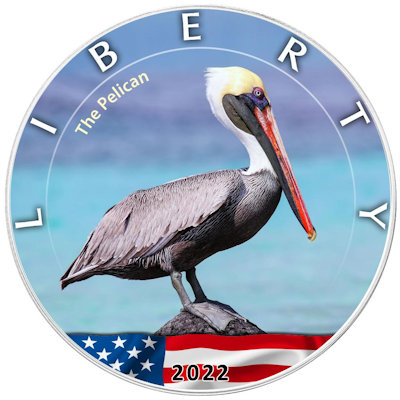 Auf dem Motiv der Silbermünze sitzt der Pelikan auf einem Felsen an der Küste. Im Hintergrund schimmert das Meer, unten weht die US-Flagge. Oben ist das Wort Liberty randläufig zu sehen. Das Sammlerstück hat einen Durchmesser von 40,60 Millimetern und enthält 1 oz Feinsilber bei einem Feingehalt von 999/1000. Der Münzrand ist geriffelt. Die Wertseite zeigt den Weißkopfseeadler, dem die Anlagemünze American Silver Eagle ihren Namen verdankt. Unten ist der Nennwert von einem US-Dollar angegeben. Die in Stempelglanz-Qualität geprägte Silbermünze hat einen geriffelten Rand und wird mit einer Karte ausgeliefert, die das Pelikan-Bild des Münzmotivs aufgreift.