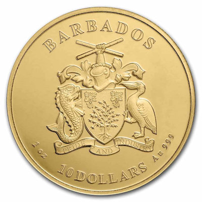 pelikan-2022-1-oz-gold-wertseiteAuf dem Motiv der Goldmünze sitzt ein Pelikan an Land und breitet eindrucksvoll seine Flügel aus. Den Kopf hält der Vogel seitlich, sodass der markante Schnabel gut zu erkennen ist. Unterhalb der Flügel sind stilisierte Wellen aufgeprägt, oben findet man randläufig den Schriftzug Caribbean Gold. Die Wertseite präsentiert das Wappen des Ausgabelands Barbados, zu dem ebenfalls ein Pelikan gehört. Zusammen mit einer Goldmakrele hält er einen Wappenschild mit einem Bartfeigenbaum unter zwei Cesalpinienblüten. Auf dem Schild liegt ein Helm, hinter dem eine Hand mit zwei gekreuzten Zuckerrohrstangen hervorragt. Unten vervollständigt ein Spruchband mit dem Motto „Pride and Industry“ (Stolz und Fleiß) das Wappen. Die Goldmünze in Stempelglanz-Prägung enthält 1 oz Feingold bei einem Feingehalt von 999/1000 und trägt den Nennwert von 10 Barbados-Dollars. Sie hat einen geriffelten Rand und wird im Etui inklusive Echtheitszertifikat ausgegeben.