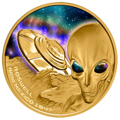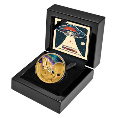 Der Name Roswell lässt die Augen von Alien-Fans und Verschwörungstheoretikern funkeln. Der Grund dafür liegt 75 Jahre in der Vergangenheit. 1947 meldete die US-Armee den Absturz eines UFOs nahe des Orts – um danach alles wieder zu dementieren. Ob der Absturz so ausgesehen hat wie auf dem Motiv der Goldmünze 75 Jahre Roswell ist zwar fraglich, trotzdem ist das Sammlerstück mit einer Auflage von nur 75 Exemplaren ideal für alle, die sich für Aliens begeistern.