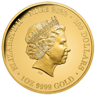 Das Motiv der Goldmünze zeigt das typische Bild eines Aliens: In den großen Augen des haarlosen Wesens spiegelt sich der bunt durchglühte Himmel. Hinter ihm hat sich sein Flugobjekt in den Boden gebohrt. Umseitig präsentiert die Goldmünze, die in der höchsten Prägequalität Polierte Platte hergestellt ist, das Porträt von Königin Elizabeth II. Ausgabeland ist Niue. Der Nennwert vopn 100 Dollars ist randläufig angegeben. Das Sammlerstück aus 1 oz Feingold (Feingehalt 999/1000) wird gekapselt, im Etui und mit Echtheitszertifikat ausgegeben. Die Umverpackung zeigt das Raumschiff auf seiner Reise zwischen fremden Planeten.