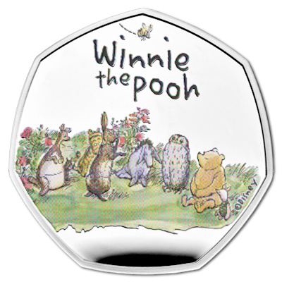 Ganz am oberen Rand des Münzmotivs verweist eine einzelne Biene auf Winnie Poohs größtes Laster: Bei Honig kann der Bär einfach nicht widerstehen. Diese Ausgabe der Münzserie zeigt ihn jedoch nicht beim Naschen, sondern mit seinen Freunden aus dem 100-Morgen-Wald. Vorbild für die Gestaltung waren die Originalillustrationen aus den 1920er Jahren. Winnie the Pooh sitzt rechts außen neben Ferkel, dann folgen Eule, I-Ahh, Tigger sowie die Kängurus Klein-Ruh und Kanga. Kaninchen steht in der Mitte dieses Halbkreises. Gras und blühende Büsche bilden den Hintergrund. Der Schriftzug Winnie the Pooh komplettiert das Bild.