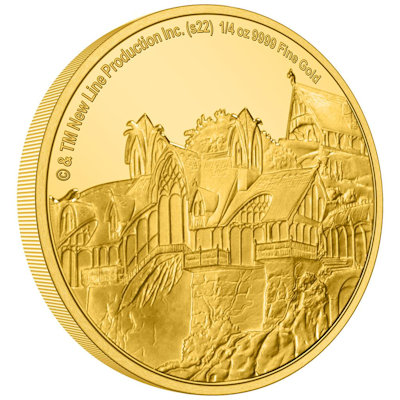 Es wird vermutet, dass ein schweizer Gebirgstal Tolkien als Vorbild für Bruchtal diente. Jedenfalls wird der Ort als enges, idyllisches Tal beschrieben. So ist er auch auf dem Motiv der Goldmünze dargestellt. Hier sieht man die an den Hang gebauten, romantisch gestalteten Häuser. Das Sammlerstück enthält 1/4 oz Feingold bei einem Feingehalt von 99,99 Prozent und ist in der höchsten Prägequalität Polierte Platte hergestellt. Der Durchmesser liegt bei 22,0 Millimetern. Umseitig findet man den Nennwert von 25 Dollars und ein Porträt von Queen Elizabeth II. Als Ausgabeland fungiert Niue. Die Goldmünzen mit geriffeltem Rand werden gekapselt, im Etui und in einem Shipper im Seriendesign ausgegeben. Ein nummeriertes Echtheitszertifikat gibt es dazu.