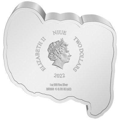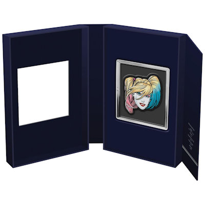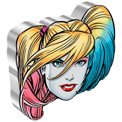 Die Silbermünze gibt als Formprägung Harley Quinns Gesicht wieder. Durch die Zöpfe ergibt sich eine fast quadratische Form mit 36,00 mal 36,00 Millmetern. Das Sammlerstück enthält 1 oz Feinsilber bei einem Feingehalt von 999/1000. Auf der Wertseite findet man das Porträt der Königin Elizabeth II. von Ian Rank-Broadley und den Nennwert von 2 Dollars. Als Ausgabeland fungiert Niue. Der Münzrand ist glatt. Die Silbermünze wird gekapselt und verpackt in ein Etui mit Sichtfenster ausgegeben. Ein nummeriertes Echtheitszertifikat gibt es dazu.