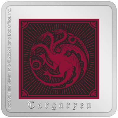 Die Silberprägung zeigt das Targaryen-Siegel, einen dreiköpfigen Drachen. Das Fabelwesen ist golden koloriert und von Ornamenten umgeben. Umseitig findet man das Bild wieder, diesmal jedoch in Rot vor schwarzem Hintergrund. Auf dieser Seite ist auch der Name Targaryen verzeichnet. Außerdem findet man am Rand den Copyright-Hinweis. Das Sammlerstück enthält 1 oz Feinsilber und ist in der höchsten Prägequalität Polierte Platte gefertigt. Es misst 35 mal 35 Millimeter und hat einen Feingehalt von 999/1000. Der Rand ist geriffelt. Ausgeliefert wird die Silberprägung im Etui und einer Umverpackung im Seriendesign, die den Eisernen Thron in Nahaufnahme zeigt.