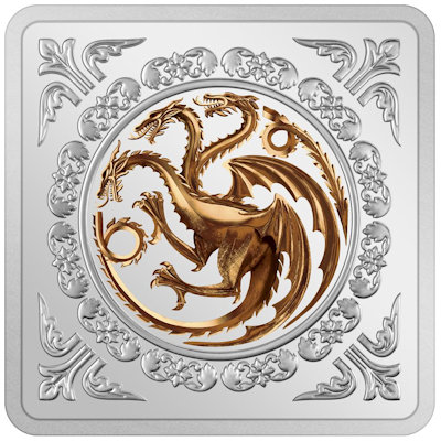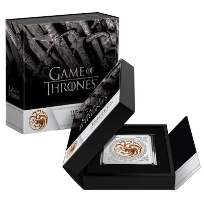 Collections zu Der Herr der Ringe, Star Wars und Harry Potter hat die New Zealand Mint längst im Programm. Da war klar, dass die prominenteste Fantasy-Saga der jüngsten Zeit wohl nicht allzu lang auf sich warten ließe: Game of Thrones ist die Inspiration für eine Silber-Serie, in der die erste Ausgabe dem legendären Haus Targaryen gewidmet ist. Das Sammlerstück aus einer Unze Feinsilber hat eine limitierte Auflage von 3.000 Exemplaren.