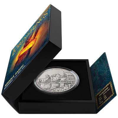 Das Motiv der Silbermünze ist mit einem Antik-Finish veredelt. Fans der Filmtrilogie erkennen den Ort dank der detailreichen Darstellung sofort. Das Sammlerstück aus 1 oz Feinsilber hat einen Feingehalt von 999/1000 und einen Durchmesser von 40 Millimetern. Der Münzrand ist geriffelt. Auf der Wertseite findet man das Porträt von Königin Elizabeth II. sowie das Ausgabeland Niue. Der Nennwert ist mit zwei Dollars angegeben. Die Silbermünze, die mit einem nummerierten Echtheitszertifikat ausgegeben wird, ist in einen Shipper im Serien-Design verpackt, der den einen Ring feurig glühend an Saurons Hand zeigt.