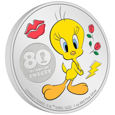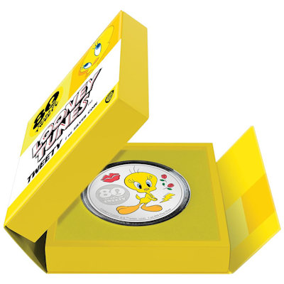 Das Motiv der Silbermünze zeigt Tweety leuchtend koloriert. Ein Kussmund, ein Blitz und Blumen, die ebenfalls bunt gestaltet sind, runden das Bild ab. Das Jubiläumslogo zeigt Tweety als Silhouette in der Null der Zahl 80. Es hebt sich mattiert von der spiegelnden Oberfläche ab. Der Münzrand ist geriffelt. Auf der Wertseite findet man das Ian-Rank-Broadley-Porträt von Königin Elizabeth II. Ausgabeland ist Niue. Der Nennwert ist mit einem Dollar angegeben. Die Silbermünze aus 1 oz Feinsilber hat einen Feingehalt von 999/1000 und einen Durchmeser von 40 Millimetern. Sie ist in höchster Proof-Qualität geprägt. Ausgegeben wird sie gekapselt und in einem kanariengelben Etui. Außerdem gibt es ein Echtheitszertifikat dazu.