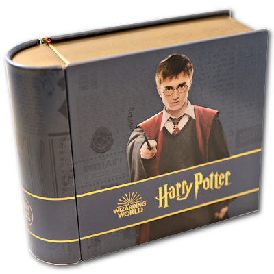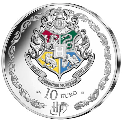 Umseitig zeigt die Silbermünze das Wappen der Zauberschule Hogwarts, auf dem die Symbole der vier verschiedenen Häuser zu erkennen sind. Der Löwe auf rotem Grund steht für Gryffindor, die Schlange mit grünem Hintergrund für Slytherin, der gelb hinterlegte Dachs für Hufflepuff und der Adler mit der Farbe Blau steht für Ravenclaw. Unter dem Nennwert von 10 Euro ist außerdem das aus den Filmen bekannte Harry-Potter-Logo aufgeprägt. Die in der höchsten Prägequalität Polierte Platte hergestellte Silbermünze hat einen Feingehalt von 900/1000 und ein Gewicht von 22,20 Gramm. Der Durchmesser liegt bei 37,00 Millimetern. Das Sammlerstück ist ein hübsches Etui verpackt, das wie ein Buch gestaltet ist und Harry Potter mit erhobenem Zauberstab zeigt. Ein Echtheitszertifikat gibt es dazu.