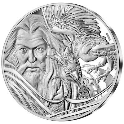 Harry Potter lernt Fawkes in Dumbledores Arbeitszimmer kennen. Gleich bei dieser ersten Begegnung zeigt er seine spektakuläre Fähigkeit zur Wiedergeburt. Später taucht der Phönix, dessen Tränen heilende Kräfte haben, immer wieder in entscheidenden Momenten auf. In Harry Potter und die Kammer des Schreckens etwa kommt er Harry in letzter Sekunde beim Kampf mit dem Basilisken zu Hilfe. Und in Harry Potter und der Orden des Phönix verhilft er Dumbledore zur Flucht, als das Ministerium ihn festsetzen will. Auf dem Motiv der Silbermünze breitet er seine Schwingen um Dumbledores Kopf aus. Von dem Meisterzauberer fallen das wallende Haar, der Bart und vor allem der aufmerksame Blick, mit dem er die Betrachter zu fixieren scheint, ins Auge.