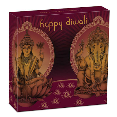 diwali-2022-1-oz-silber-vergoldet-etuiDiwali wird im Herbst gefeiert, 2022 ab dem 24. Oktober. Häuser, Straßen und Geschäfte werden zu diesem Anlass mit Lampen und Kerzen geschmückt, außerdem gibt es Feuerwerk. Gefeiert wird der Sieg des Guten über das Böse, wobei das Fest in verschiedenen Regionen mit unterschiedlichen Göttern in Verbindung gebracht wird. Eine davon ist Lakshmi, die Göttin des Wohlstands, die auf dem Motiv der Silberprägung auf einer Lotosblüte sitzend dargestellt ist. Aus ihrer offenen Hand fallen Münzen in eine Schüssel. Links und rechts hängen zwei detailreich gestaltete Lampen. Unten vervollständigt der Schriftzug „Happy Diwali“ das Motiv.