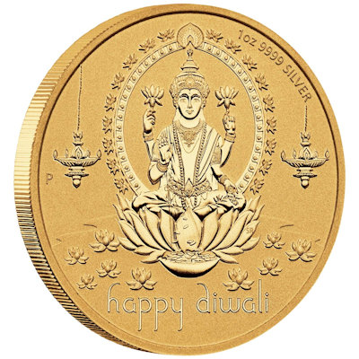 diwali-2022-1-oz-silber-vergoldetZum indischen Lichterfest Diwali, das von Hindus, Sikhs und anderen Religionen gefeiert wird, gibt die australische Perth Mint jährlich eine aufwendige Silberprägung heraus. Dieses Jahr strahlt das Sammlerstück sogar noch mehr, da es komplett vergoldet wurde. Das Motiv ist mit indischen Göttern geschmückt, die den Gläubigen im kommenden Jahr Glück bringen sollen.