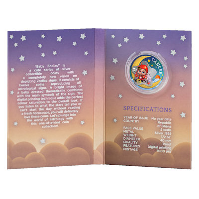 Neben dem Baby im Krebskostüm sind eine opulente Muschel mit einer Perle und ein Seestern zu sehen. Eine Mondsichel und Sterne bilden den Hintergrund. Die Silbermünze aus 1/2 oz Feinsilber hat einen Feingehalt von 999/1000 und ist in der höchsten Prägequalität Polierte Platte hergestellt. Sie hat einen Durchmesser von 40 Millimetern. Die Wertseite zeigt das Porträt von Königin Elizabeth II. und den Nennwert von 2 Cedis. Verpackt ist das niedliche Sammlerstück in ein passendes Etui mit Sternenhimmel- und Wolken-Design.