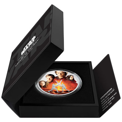 star-wars-anakin-skywalker-vs-obi-wan-kenobi-3-oz-silber-koloriert-wertseiteAuf dem Motiv der Silbermünze sind die beiden Kämpfenden mit gekreuzten Lichtschwertern im Vordergrund aufgeprägt. Das mattierte Finish hebt sie eindrucksvoll vom kolorierten Hintergrund ab, den neben den beiden Kontrahenten auch die Gesichter von Padmé Amidala und Imperator Palpatine zieren, zwischen denen Anakin in Episode III steht. Das Sammlerstück hat einen Durchmesser von 55 Millimetern und enthält 3 oz Feinsilber bei einem Feingehalt von 999/1000. Der Münzrand ist geriffelt. Die Wertseite zeigt das Porträt von Elizabeth II. und den Nennwert von 10 Dollars. Als Ausgabeland fungiert Niue. Das Sammlerstück, das in der höchsten Prägequalität Polierte Platte hergestellt ist, ist in ein Etui im Star-Wars-Design verpackt und wird mit einem nummerierten Echtheitszertifikat ausgegeben.