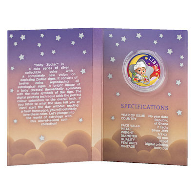 baby-zodiac-waage-half-oz-silber-koloriert-wertseiteEgal ob eiserner Wille oder nachgiebiges Naturell, Waagen mit Sinn für das Niedliche werden sich über diese Silbermünze als Glücksbringer freuen. Das Baby im Kochoutfit, das fleißig Gemüse wiegt, ist in einen Hintergrund mit Mond und Sternen eingebettet. Das astronomische Symbol des Sternzeichens ist geschickt in die Waage intergriert. Das Sammlerstück hat einen Durchmesser von 40 Millimetern und enthält 1/2 oz Feinsilber  bei einem Feingehalt von 999/1000. Es ist in der höchsten Prägequalität polierte Platte hergestellt. Die Wertseite zeigt das Porträt von Königin Elizabeth II. und den Nennwert von 2 Cedis. Komplettiert wird diese Geschenkidee durch das Etui, das einen Abendhimmel mit rosa Wolken und Sternen zeigt.