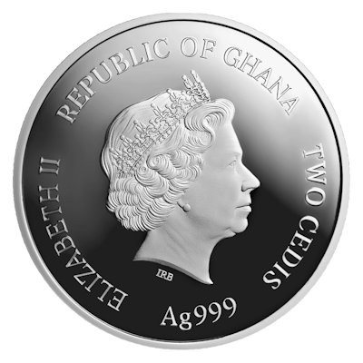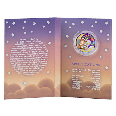 Das Sternzeichen-Baby auf dem Motiv der kolorierten Silbermünze hält einen Bogen in den Händen und hat einen Pfeil eingelegt, dessen Spitze das astronomische Symbol des Sternzeichens bildet. Der Hintergrund ist mit Wolken, rosa Himmel und Mondsichel gestaltet – ebenso wie das Etui. Das Sammlerstück ist in der höchsten Prägequalität Polierte Platte hergestellt und hat einen Durchmesser von 40 Millimetern. Es enthält 1/2 oz Feinsilber bei einem Feingehalt von 999/1000. Die Wertseite zeigt das Porträt von Königin Elizabeth II. und den Nennwert von 2 Cedis. Ausgabeland ist die Republik Ghana.