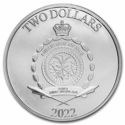 Die Silbermünze ist in Stempelglanz-Qualität geprägt und enthält 1 oz Feinsilber. Sie hat einen Durchmesser von 39 Millimetern und einen geriffelten Rand. Der Feingehalt liegt bei 999/1000. Die Wertseite zeigt das Siegel des Ausgabelands Niue. Der Nennwert von 2 Dollars ist oben angegeben, unten findet man die Jahreszahl 2022. Ausgeliefert werden die Bullionmünzen je nach Menge in Tubes zu 25 Stück oder einzeln.