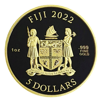 Die Goldmünze enthält 1 oz Feingold bei einem Feingehalt von 999/1000. Die Wertseite zeigt das Wappen des Ausgabelands Fidschi: Darauf sind typische einheimische Früchte – Zuckerrohr, eine Bananenstaude und eine Kokospalme – zusammen mit einem Löwen auf einem Wappenschild zu sehen, der von einem Schiff gekrönt wird. Zwei Krieger halten den Schild. Unten ist der Nennwert von 5 Dollars verzeichnet. Die Hunde-Goldmünzen werden einzeln gekapselt ausgegeben.
