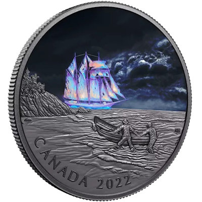 Auf dem Motiv der Silbermünze sind zwei Männer zu sehen, die ein Ruderboot ins Wasser befördern. Am Himmel ballen sich düstere Wolken zusammen. Im Schwarzlicht taucht am Horizont das geheimnisvoll leuchtende Geisterschiff mit seinen zerfetzten Segeln auf. Die Wertseite zeigt das Porträt von Königin Elizabeth II. vor einem Hintergrund aus Ahornblättern. Darunter ist der Nennwert von 50 CAD aufgeprägt. Die Silbermünze enthält 5 oz Feinsilber und hat einen Durchmesser von 65,25 Millimetern. Der Feingehalt liegt bei 99,99 Prozent. Der Münzrand ist geriffelt. Ausgegeben wird das Sammlerstück im Etui und mit nummeriertem Echtheitszertifikat.
