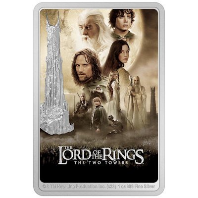 herr-der-ringe-die-zwei-tuerme-1-oz-silber-koloriert-etuiDie zwei Türme, die dem zweiten Teil von Tolkiens Saga den Namen geben, flankieren das Motiv der Silbermünze: links der dunkle Turm in Mordor, der graviert und mit matten Finish aus dem Bild heraussticht, rechts der Orthanc. Letzterer ist die Heimat des Zauberers Saruman, der das Bündnis gegen Sauron aus Machtgier verraten hat und nun in Isengart sein eigenes Süppchen kocht und Orks züchtet. Er möchte den Ring für sich haben, doch stattdessen rufen seine Intrigen die Ents auf den Plan: Als diese sehen, wie Saruman die Wälder abholzt, greifen sie ihn an und setzen ihn schließlich in seinem Turm gefangen. Währenddessen haben Frodo und Sam, die unterwegs zum anderen Turm aus dem Titel sind, Gesellschaft bekommen: Gollum ist zu ihrem Führer geworden – doch gleichzeitig giert er danach, den Ring wieder an sich zu bringen.
