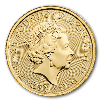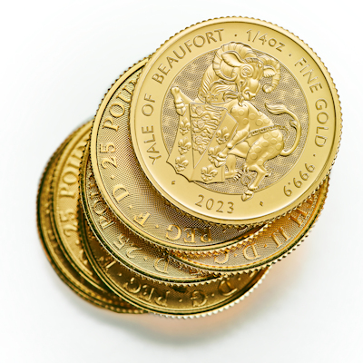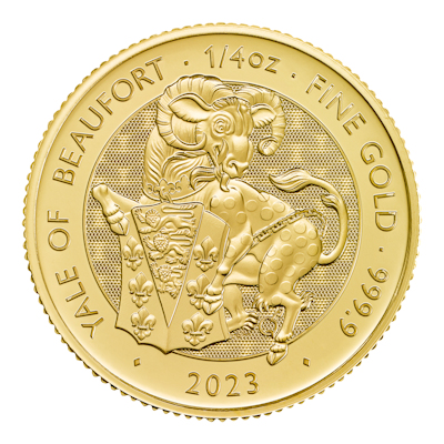 Die Gefährlichkeit des Yales auf der Goldmünze wird durch die Kette symbolisiert, mit der es gefesselt ist. Es hält einen Schild, der englische Löwen und französische Lilien zeigt. Unten ist die Jahreszahl 2023 verzeichnet, randläufig der Feingehalt von 99,99 Prozent. Die Münze aus 1/4 oz Feingold hat einen Durchmesser von 22,0 Millimetern und einen geriffelten Rand. Umseitig ist das Porträt von Königin Elizabeth II. zu sehen. Die Goldmünze ist in Stempelglanz-Qualität geprägt.
