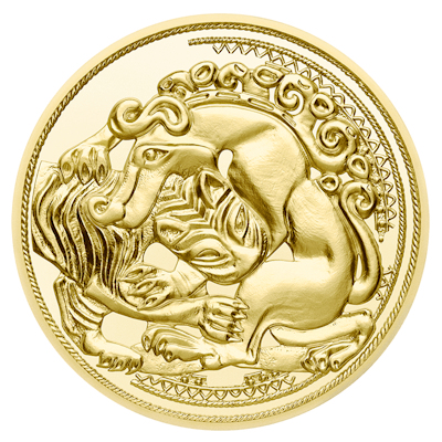 Zwischen 800 und 700 v. Chr. tauchte nördlich des Schwarzen Meeres ein Volk von kriegerischen Reiternomaden auf – die Skythen. Mehrere Jahrhunderte trieben sie ihre Herden über die Steppen. Sie bauten keine Städte oder prunkvollen Tempel, doch ihre Toten bestatteten sie mit wertvollen goldenen Beigaben: Goldplättchen schmückten die Gewänder der Fürsten, Schmuck aus massivem Gold, dekoriert mit kunstvollen Tierfiguren, wurde den hohen Herrschaften ins Grab gelegt. Schon Zar Peter der Große interessierte sich für dieses faszinierende Volk, das einst auf dem Gebiet seines Reichs gelebt hatte. Aus seiner Sammlung stammt das Stück, das Vorbild für das Motiv der Goldmünze war – eine detailreiche Tierdarstellung.
