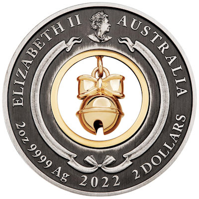 jingle-bells-1-oz-silber-antik-finish-wertseiteDer Silberring um das Glöckchen ist wie ein Weihnachtskranz mit Zweigen und Beeren gestaltet. Vor dem mit Antik-Finish veredelten Silber leuchten Kugeln und Zuckerstangen. Das Sammlerstück besteht aus 2 oz Feinsilber  (Feingehalt 99,99 Prozent) und hat einen Durchmesser von 45,60 Millimetern. Der Münzrand ist geriffelt. Das Porträt von Königin Elizabeth II. auf der Wertseite ist nach oben verschoben. Unten findet man den Nennwert von 2 Dollars und  die Jahreszahl 2022. Als Ausgabeland fungiert Australien. Die Silbermünze wird eingebettet in ein Präsentationsetui ausgegeben. Außerdem gehören eine Geschenkverpackung mit großer Schleife und ein nummeriertes Echtheitszertifikat dazu.